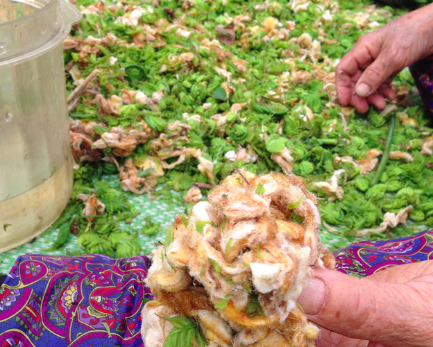 葉っぱなどの不純物を取り除いて、綿と混ぜて、反物を作っていたそうです。